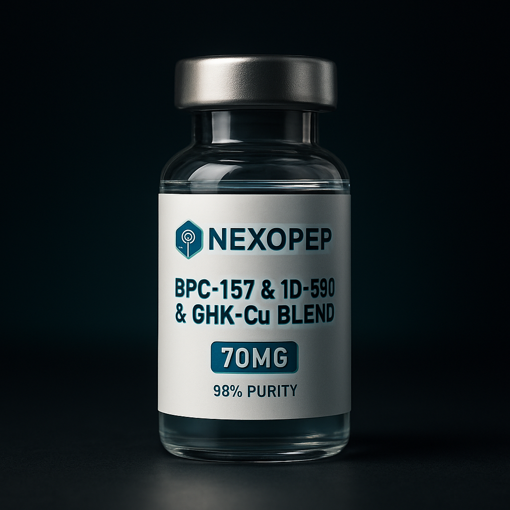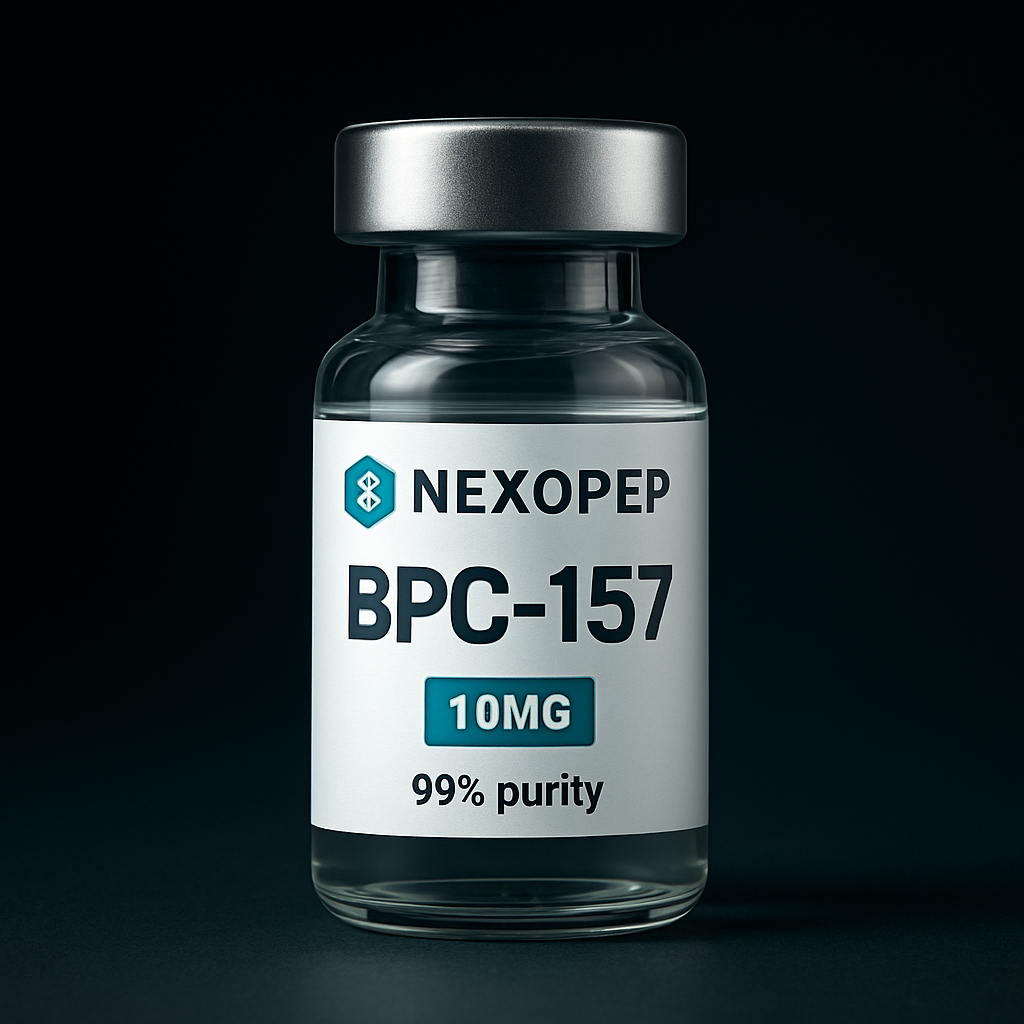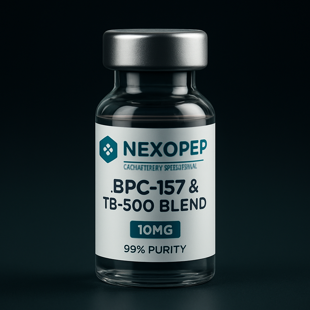 A premium pharmaceutical peptide vial mockup on a dark gradient background (black fading into deep teal/blue), featuring a realistic glass vial with a metallic silver cap. The label is minimal and modern with white and teal accents, displaying the brand name ‘Nexopep’ at the top and the product name ‘CJC-1295 No DAC & Ipamorelin Blend ’ in bold. Include ‘10MG’ in a clean badge and ‘99% purity’ below it. The lighting is soft and cinematic with subtle reflections and shadows, creating a high-end biotech aesthetic. Ultra-realistic, centered composition, sharp focus, professional product render.