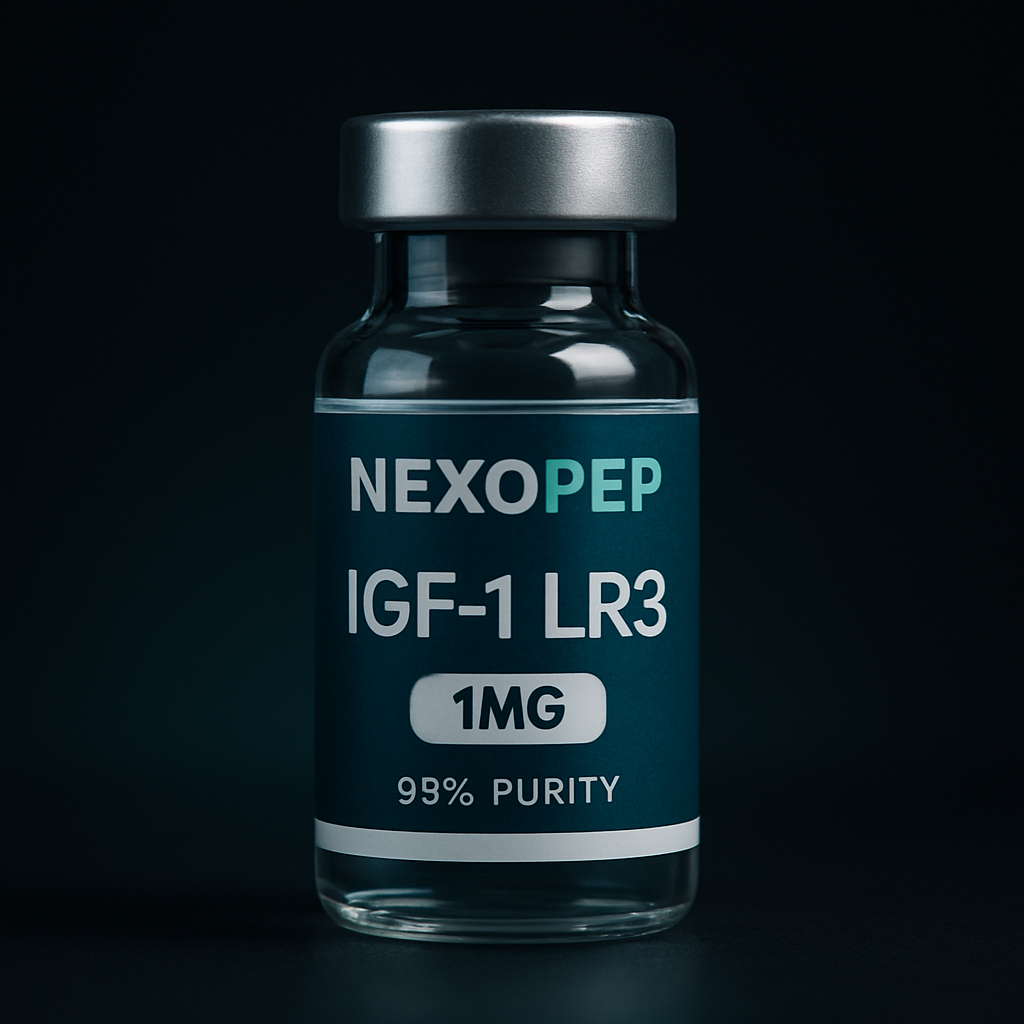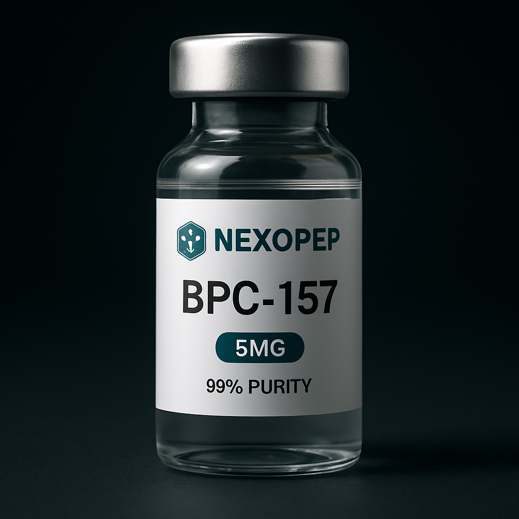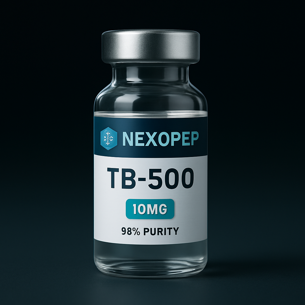 A premium pharmaceutical peptide vial mockup on a dark gradient background (black fading into deep teal/blue), featuring a realistic glass vial with a metallic silver cap. The label is minimal and modern with white and teal accents, displaying the brand name ‘Nexopep’ at the top and the product name ‘CJC-1295 No DAC & Ipamorelin Blend ’ in bold. Include ‘10MG’ in a clean badge and ‘99% purity’ below it. The lighting is soft and cinematic with subtle reflections and shadows, creating a high-end biotech aesthetic. Ultra-realistic, centered composition, sharp focus, professional product render.